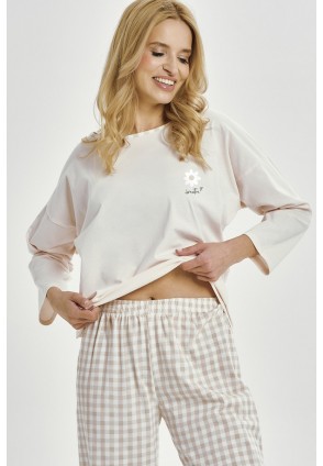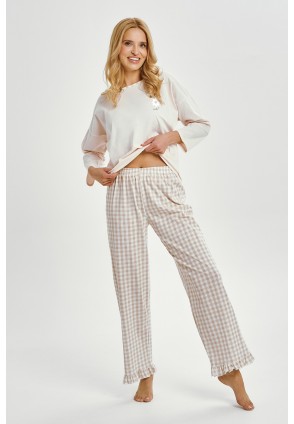 Пижама женская со штанами из высококачественного тонкого хлопка. Футболка с длинным рукавом. На груди декоративный принт. Брюки длинные, в мелкую клетку, удобная резинка на талии, низ брюк с рюшей.