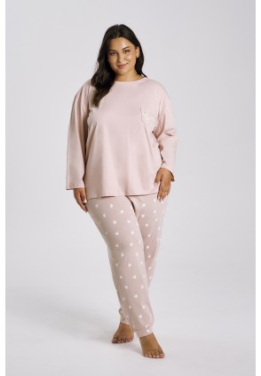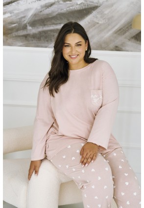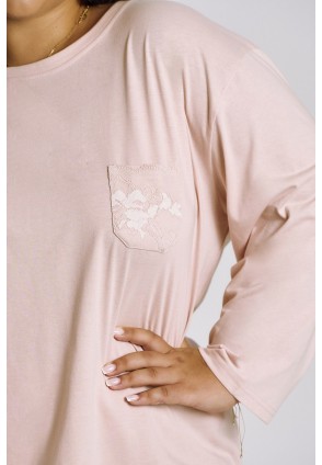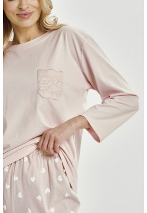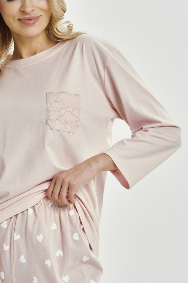 Однотонная футболка с рукавами 7/8, на груди эффектный кружевной карман, полукруглый вырез. Брюки длинные, с узором в виде сердца, удобная резинка на талии.