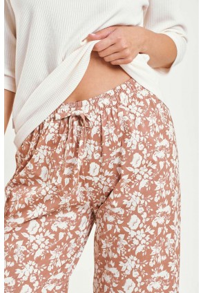 Пижама женская со штанами. Верх свободного кроя в полоску, рукав 3/4, круглый вырез горловины. Хлопковые укороченные брюки, украшенные цветочным принтом, пояс со шнурком.