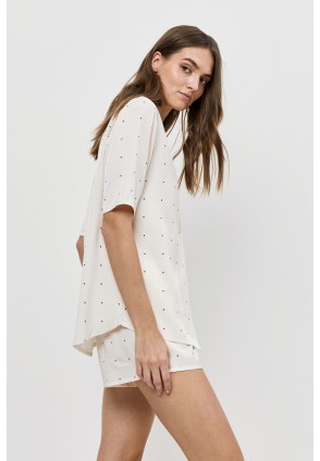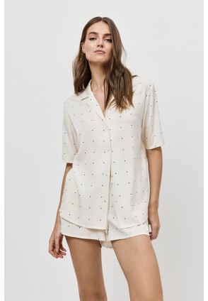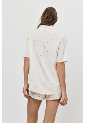 Побалуйте себя роскошной гладкостью пижамы ALBA. Пижама женская с шортами. Рубашка на пуговицах, с короткими рукавами. Короткие шорты с поясом на эластичной резинке. Выполнена из шелковистой атласной вискозы. Принт мелкий горошек.