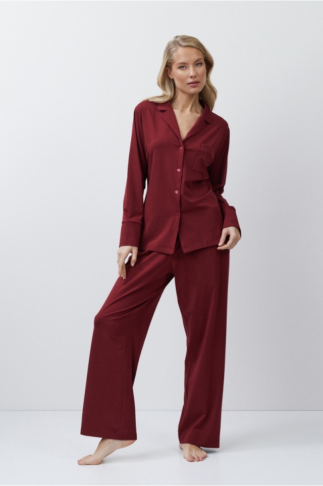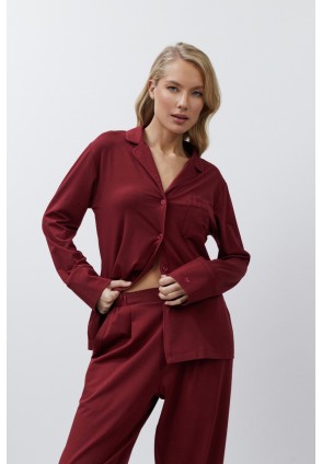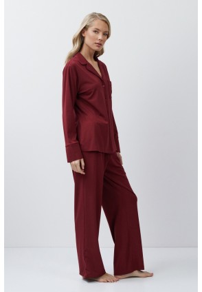 Пижама женская со штанами CADANCE BURGUNDY для вашего ночного комфорта. Пижама выполнена из эластичной ткани в состав которой входит модал и хлопок. Рубашка на пуговицах, с длинными рукавами, отложным воротником и нагрудным карманом. Окантовка дополняет и украшает комплект. Штаны длинные, свободной формы, с эластичным поясом и боковыми карманами. Расслабьтесь с максимальным комфортом и стилем в пижаме CADANCE.