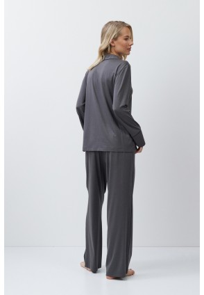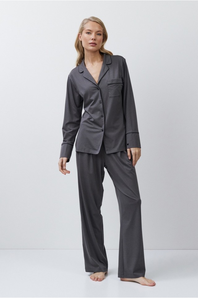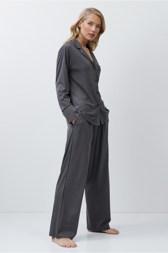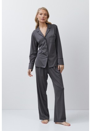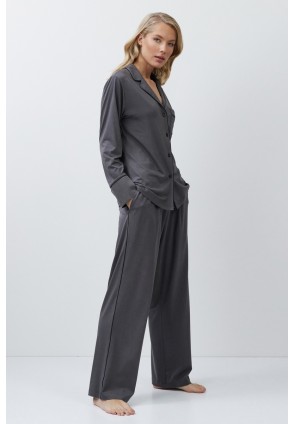 Пижама женская со штанами CADANCE GREY для вашего ночного комфорта. Пижама выполнена из эластичной ткани в состав которой входит модал и хлопок. Рубашка на пуговицах, с длинными рукавами, отложным воротником и нагрудным карманом. Окантовка дополняет и украшает комплект. Штаны длинные, свободной формы, с эластичным поясом и боковыми карманами. Расслабьтесь с максимальным комфортом и стилем в пижаме CADANCE.