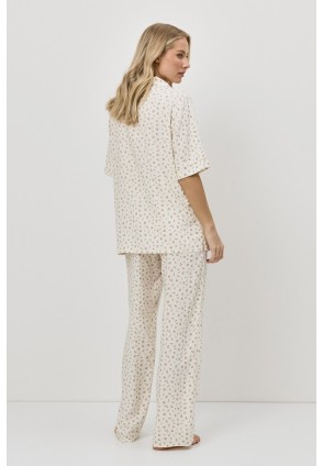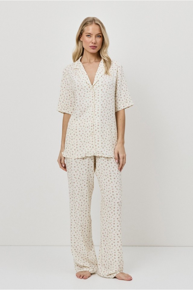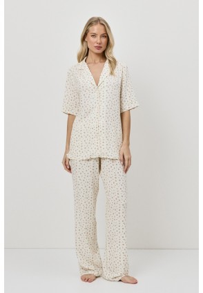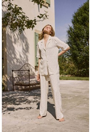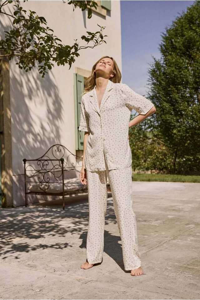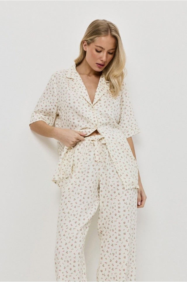 Представляем вашему вниманию пижаму со штанами CAPRIELLE - воплощение мечты. Изготовлена из лёгкой вискозы. Рубашка на пуговицах с короткими рукавами, окантовкой на рукавах и V-образным вырезом с отложным воротником. Штаны с эластичным поясом с завязкой. Этот комплект излучает необузданное очарование.