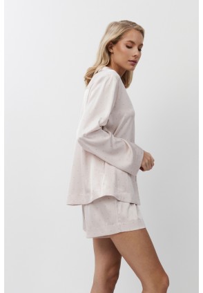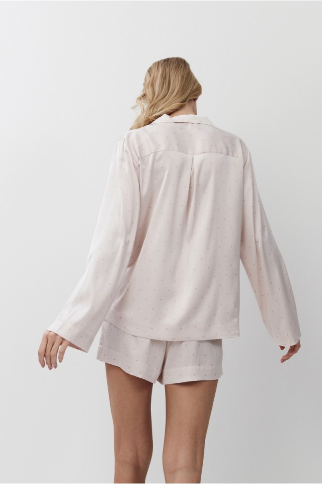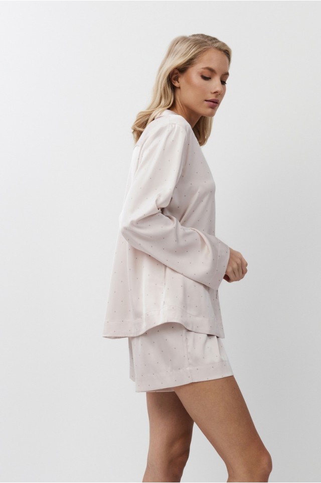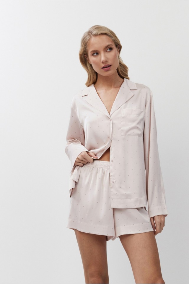 Пижама женская с шортами GILIAN для вашего ночного комфорта. Пижама выполнена из шелковистого сатина. Рубашка на пуговицах, с длинными рукавами, отложным воротником и нагрудным карманом. Шорты свободные, с эластичным поясом. Расслабьтесь с максимальным комфортом и стилем в пижаме GILIAN.