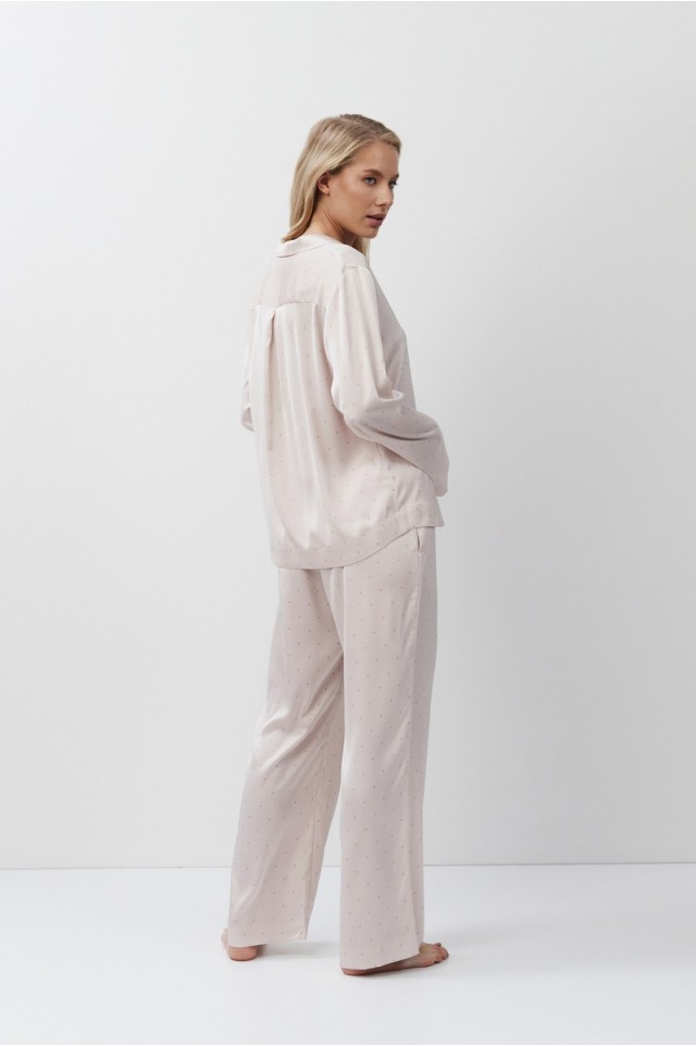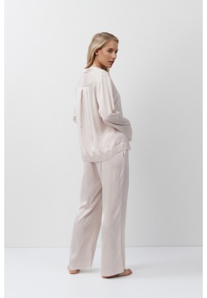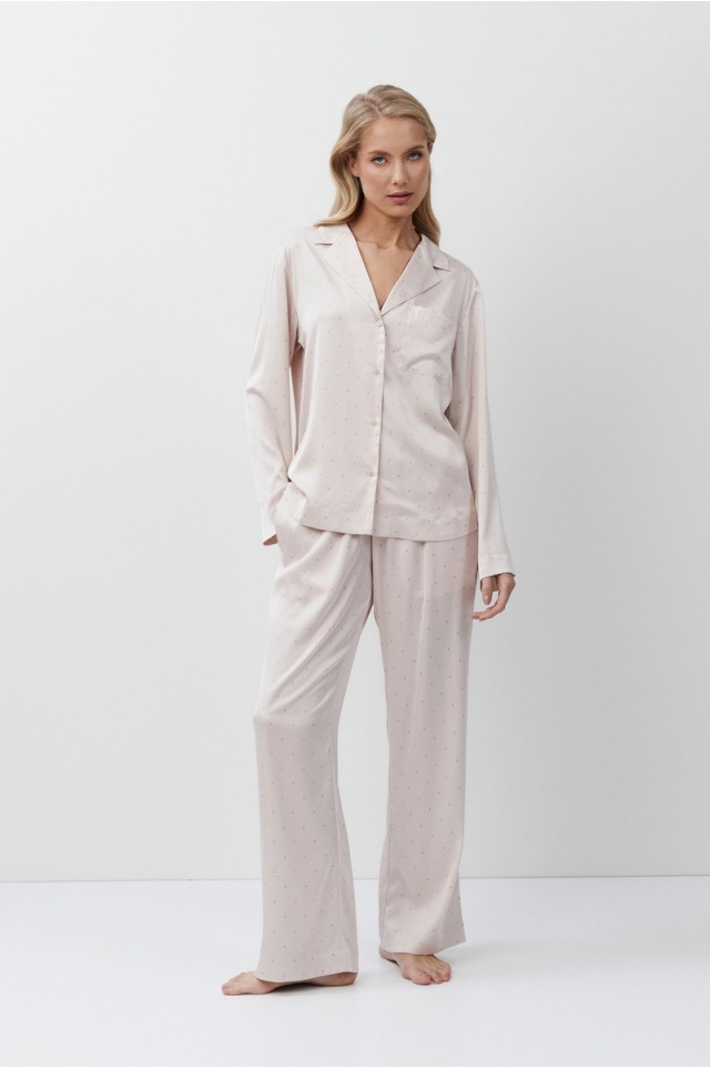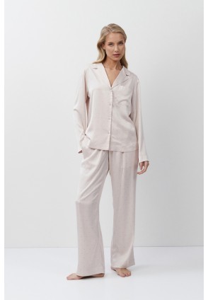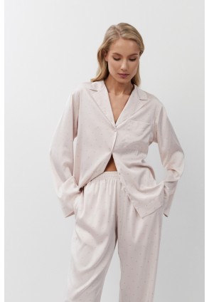 Пижама женская со штанами GILIAN для вашего ночного комфорта. Пижама выполнена из шелковистого сатина. Рубашка на пуговицах, с длинными рукавами, отложным воротником и нагрудным карманом. Штаны свободные, с эластичным поясом. Расслабьтесь с максимальным комфортом и стилем в пижаме GILIAN.