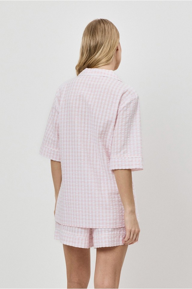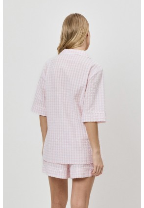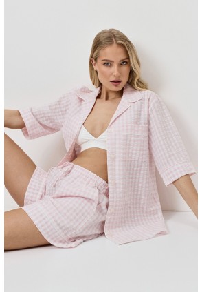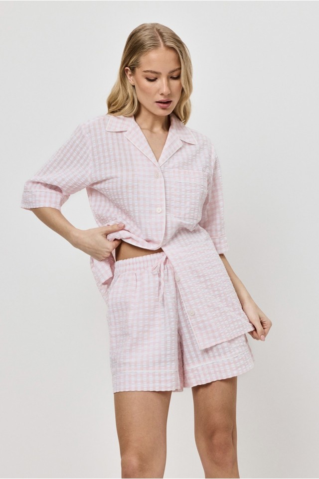 Пижама женская с шортами JULIENNE для вашего ночного комфорта. Пижама выполнена из хлопка с жатым эффектом ткани. Рубашка на пуговицах, с короткими рукавами, отложным воротником и нагрудным карманом. Окантовка украшает изделие. Шортыы свободного кроя, эластичный пояс с кулиской, по бокам карманы. Расслабьтесь с максимальным комфортом и стилем в пижаме JULIENNE.