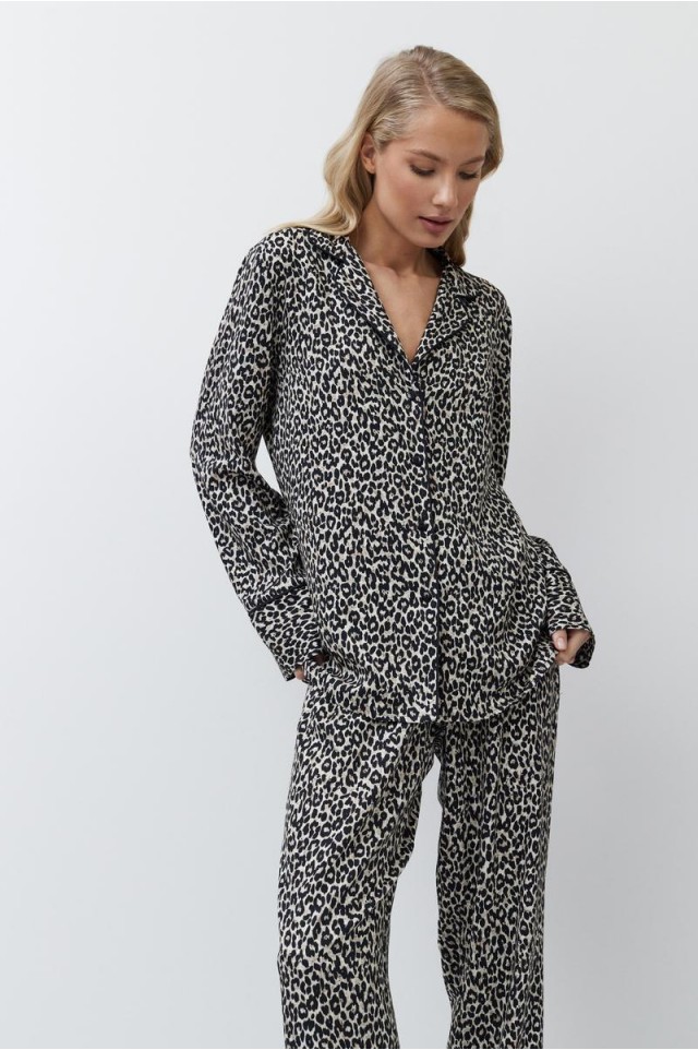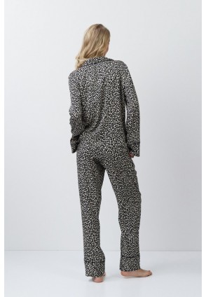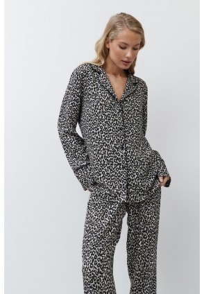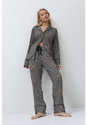 Пижама женская со штанами LEONA для вашего ночного комфорта. Пижама выполнена из вискозы с легким эластаном, с животным принтом. Рубашка на пуговицах, с длинными рукавами и отложным воротником. Окантовка дополняет и украшает комплект. Штаны свободные, с эластичным поясом с завязкой. Расслабьтесь с максимальным комфортом и стилем в пижаме LEONA.