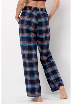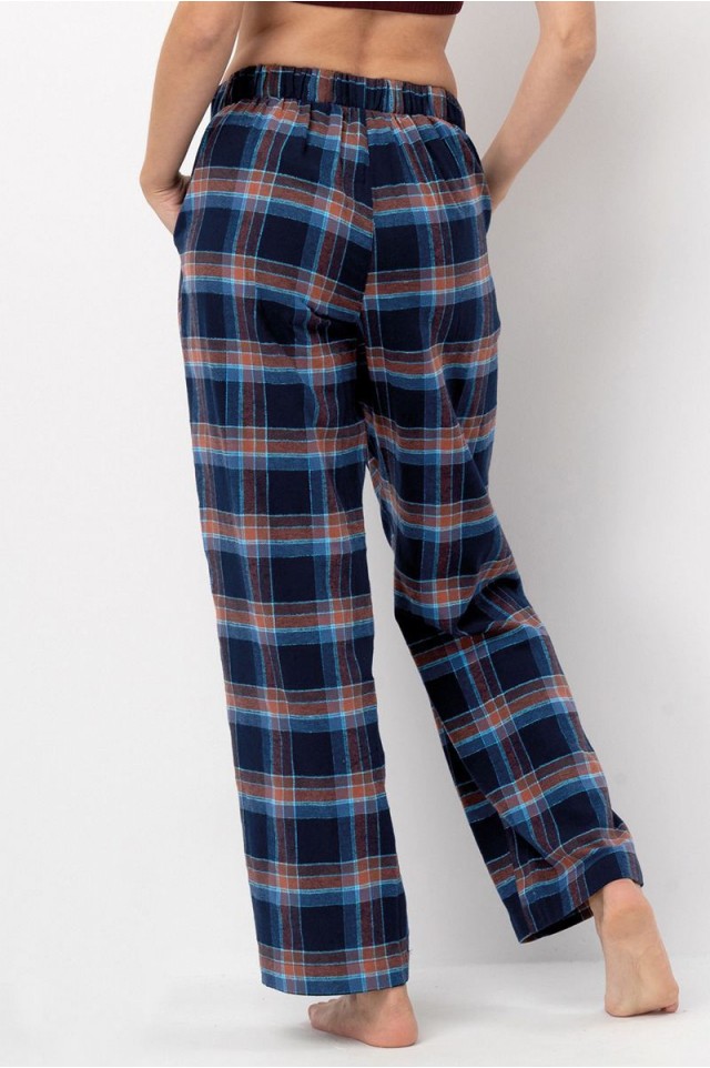 Очень удобные и теплые женские фланелевые брюки. Красивое сочетание глубокого темно-синего и шоколадно-коричневого цветов подарит вам и вашему телу отличное настроение. Нежная блестящая нить придает брюкам уникальность. Для женщин, которые любят фланелевые пижамы, но чувствуют, что хотят больше свободы и комфорта в бедрах. Очень свободный крой штанины вокруг бедер, благодаря передним вытачкам и уникальному дизайну пояса. Передняя часть пояса гладкая, слегка усилена широкой резинкой, мягко обхватывает живот. Сзади пояс собран на резинку, что дает полную свободу ягодицам. Декоративный разрез и две пуговицы спереди. Удобные, незаметные карманы по бокам. Исключительно теплая и удивительно приятная на ощупь фланелевая ткань согреет ваши ноги холодными днями. Они также отлично подойдут в качестве теплых домашних брюк. 100% высококачественные хлопковые волокна в сочетании с правильной строчкой и нитками обеспечивают комфорт, прочность и долговечное использование.