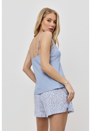 Пижама женская с шортами. Шелковистый топ с тонкими регулируемыми бретелями идеально садится по фигуре. Декорирован кружевом. Короткие шорты на эластичной резинке в поясе с кулиской. По бокам маленькие разрезы.