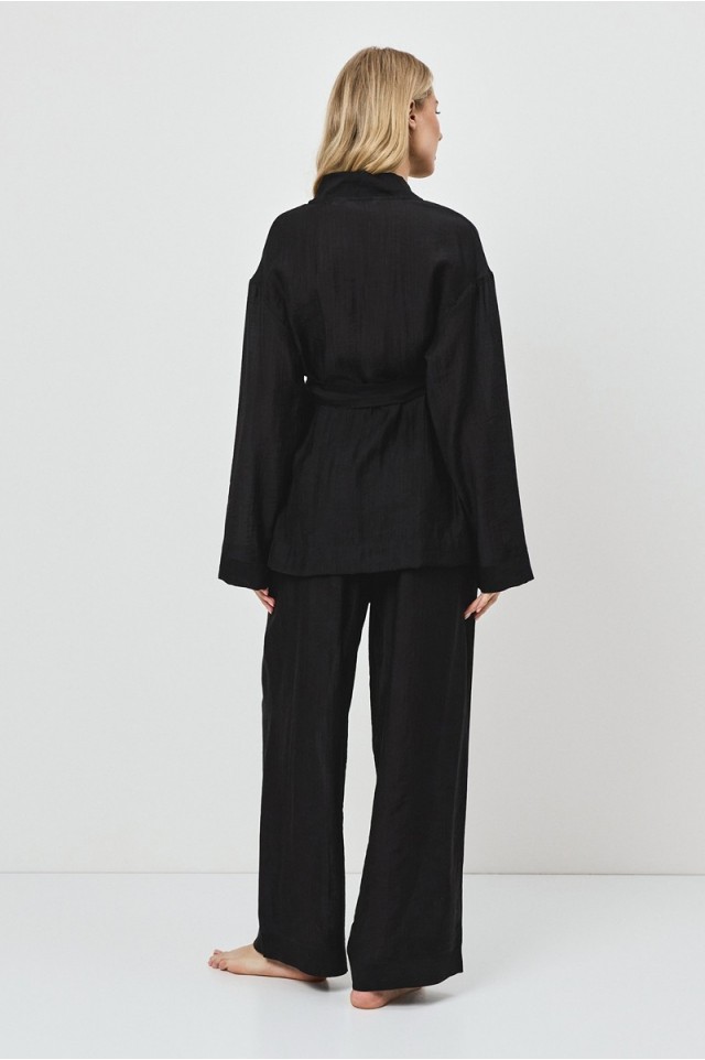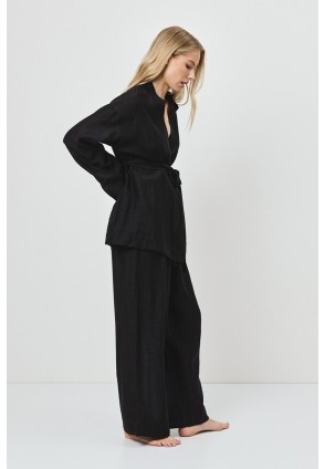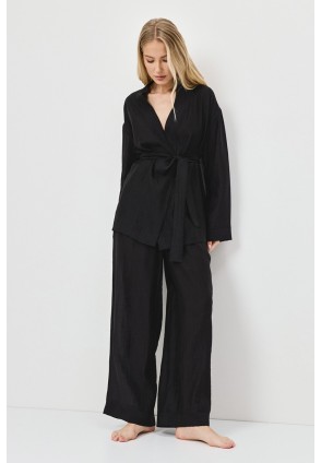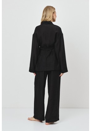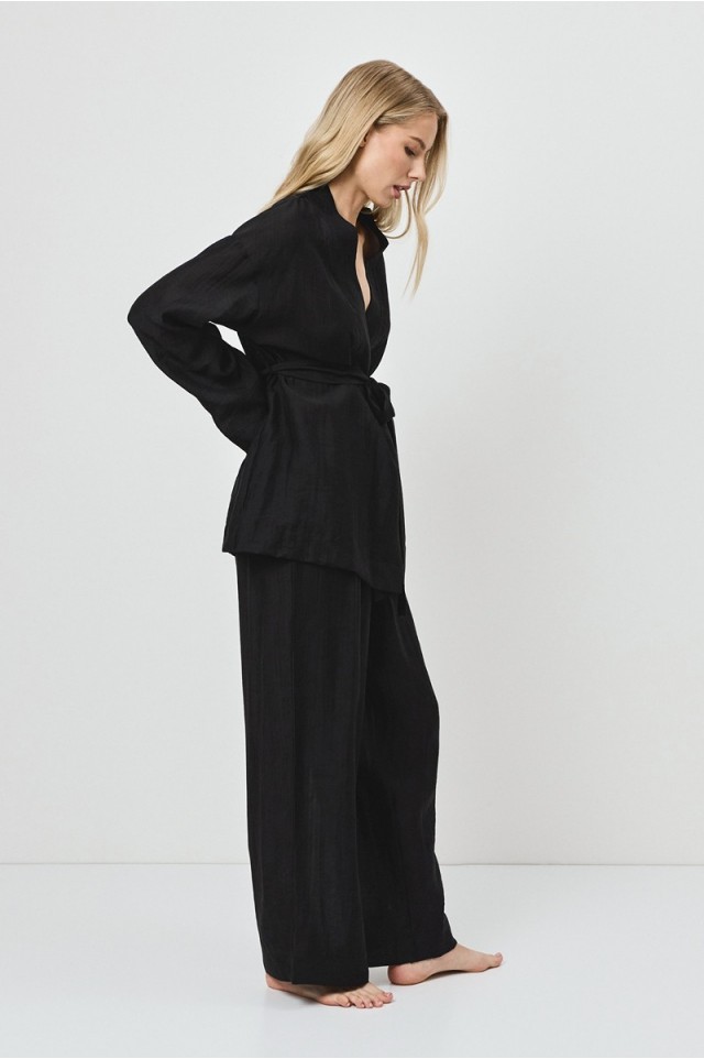 Представляем вам комплект NOIR — воплощение лёгкого стиля и комфорта, идеально подходящее для неспешных прогулок или морских приключений. Комплект женский со штанами из легкого материала тенсель. Рубашка с длинными рукавами. Поясок подчеркивает талию. Штаны длинные, свободного кроя.