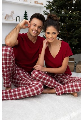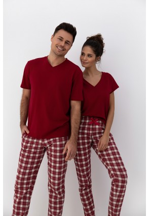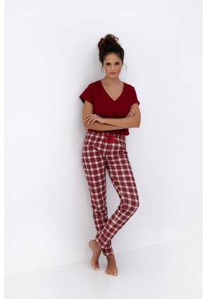 Пижама Alivia темно-красного цвета состоит из зауженных брюк в клетку и футболки с v-образным вырезом. Брюки на широкой резинке, декорированы бантиком на поясе. Идеальный вариант не только для сна, но и для домашнего отдыха.