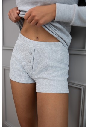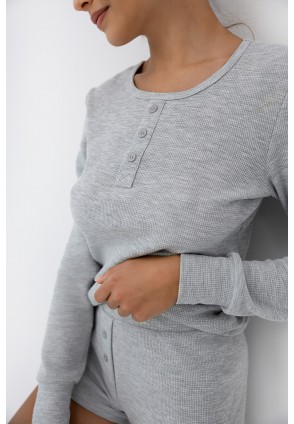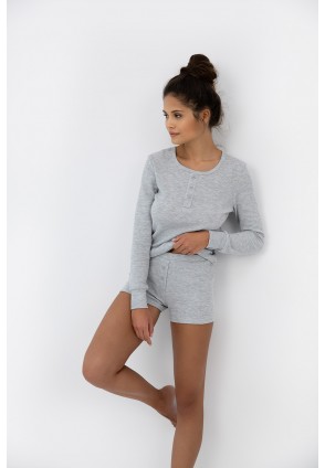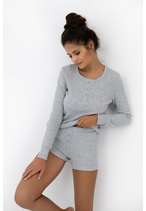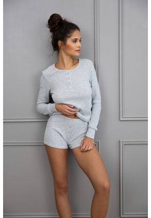 Пижама Brittany серого цвета в рубчик состоит из шортиков и лонгслива с длинными рукавами. Круглый вырез горловины, воротник на кулиске. Идеальный вариант не только для сна, но и для домашнего отдыха.