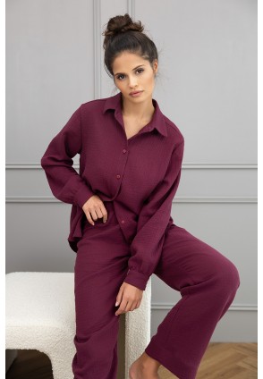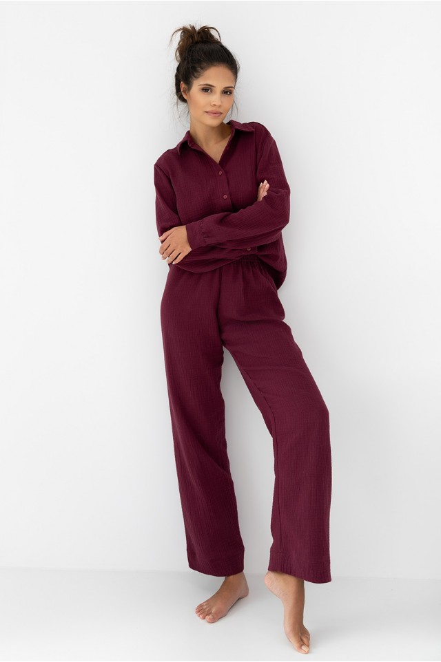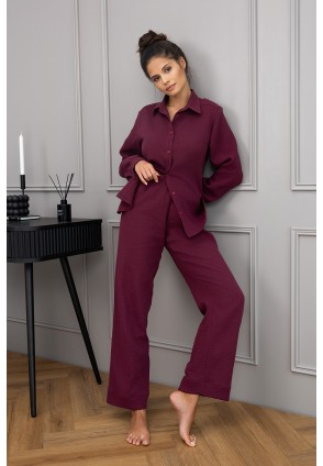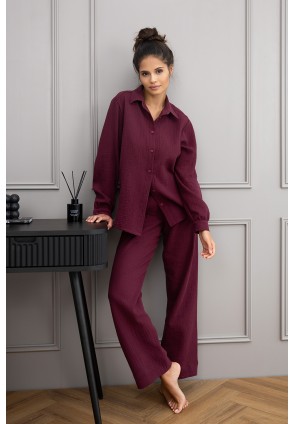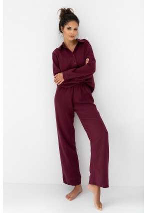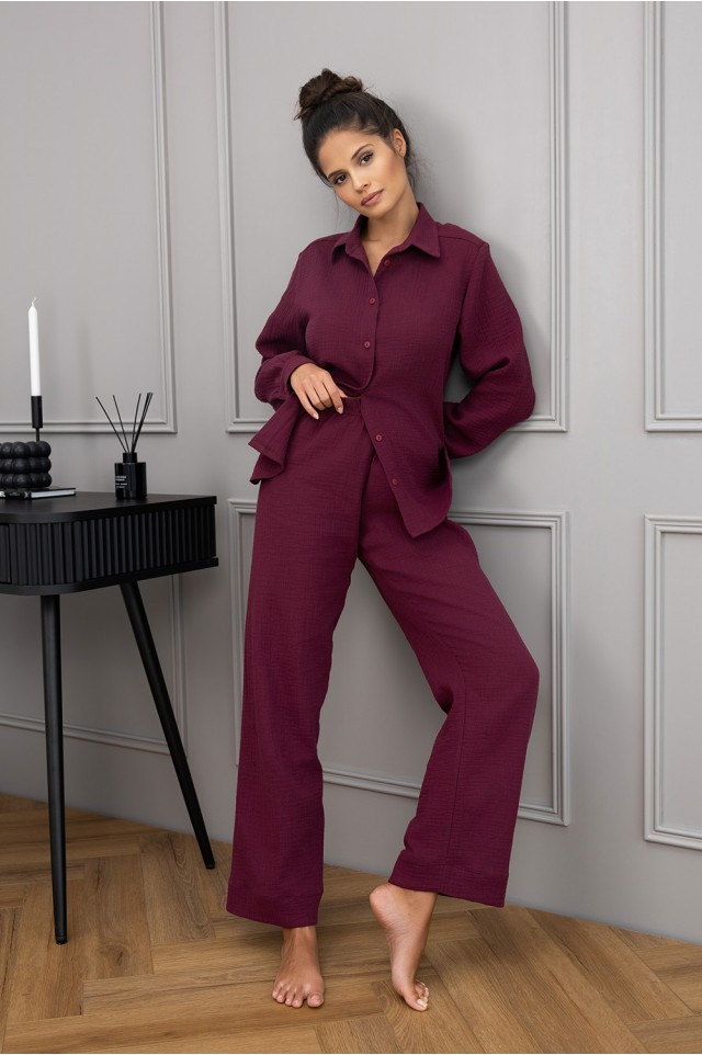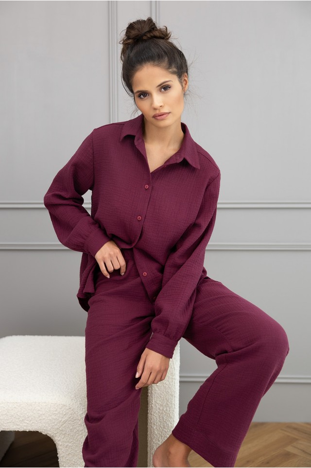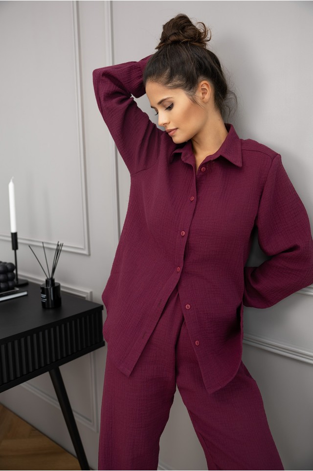 Роскошный комплект Colette винного оттенка состоит из рубашки на пуговицах и брюк-палаццо. Материал изделия легкий, дышащий. Идеальный вариант не только для дома, но и для прогулок.