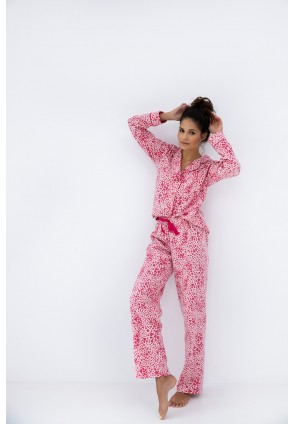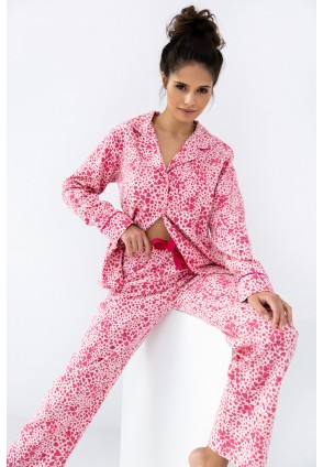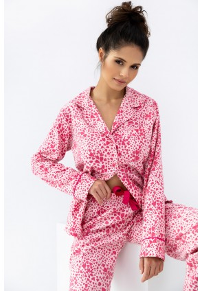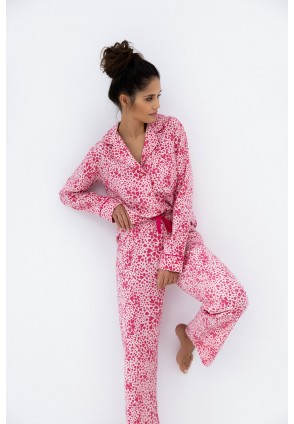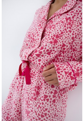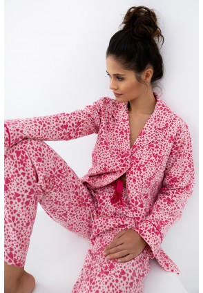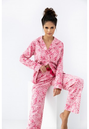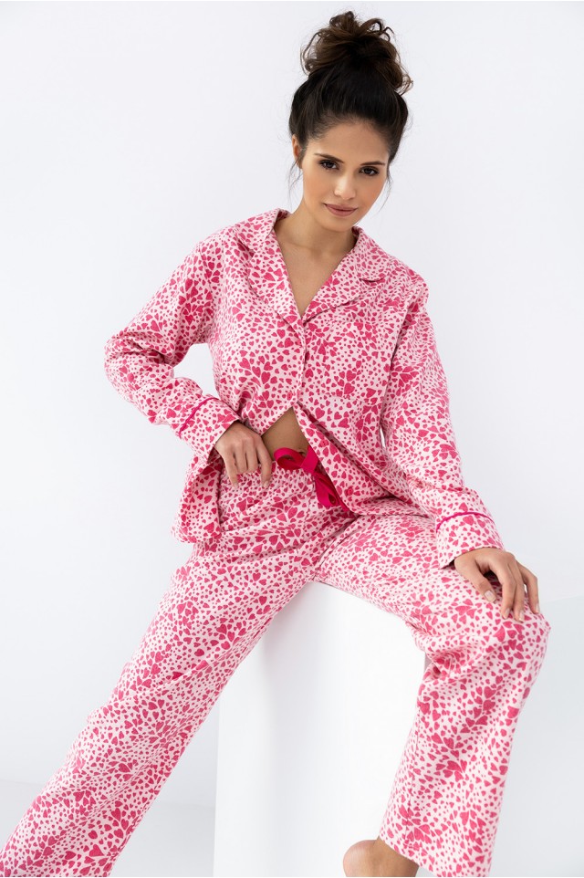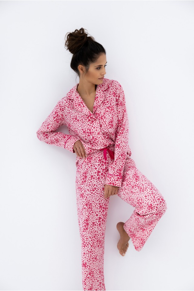 Романтичный домашний комплект Giuliana состоит из прямых брюк и рубашки. Брюки на широкой резинке, декорированы контрастным бантиком на поясе. Рукава оформлены манжетами. Материал изделия выполнен с интересным принтом сердечки. Идеальный вариант не только для сна, но и для домашнего отдыха.