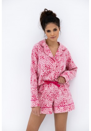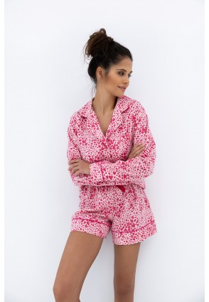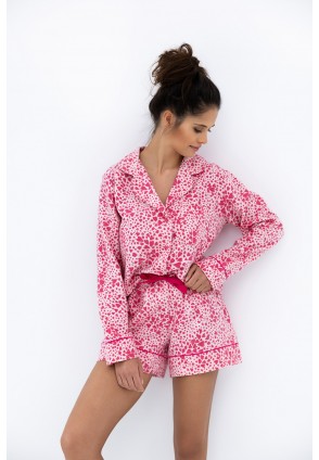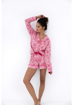 Романтичный домашний комплект Kenzie состоит из шорт и рубашки. Шортики на широкой резинке, декорированы контрастным бантиком на поясе. Рукава оформлены манжетами. Материал изделия выполнен с интересным принтом сердечки. Идеальный вариант не только для сна, но и для домашнего отдыха.