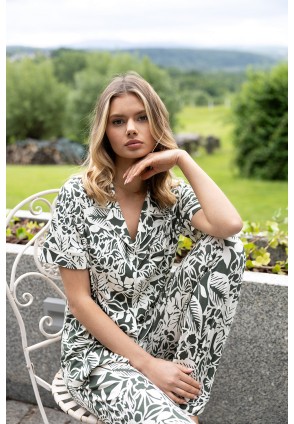 Роскошный комплект Louise состоит из рубашки с коротким рукавом и брюк прямого кроя. Рубашка с фигурным воротником, глубоким вырезом горловины. Материал декрирован контрастным абстрактным принтом. Идеальный вариант не только для сна, но и для домашнего отдыха.