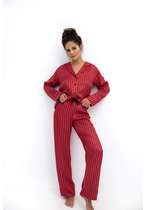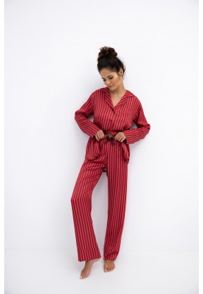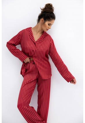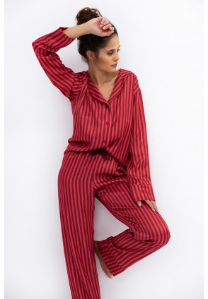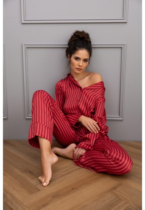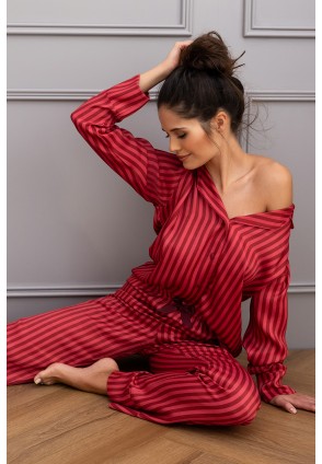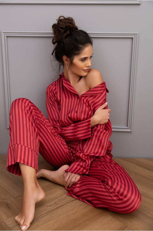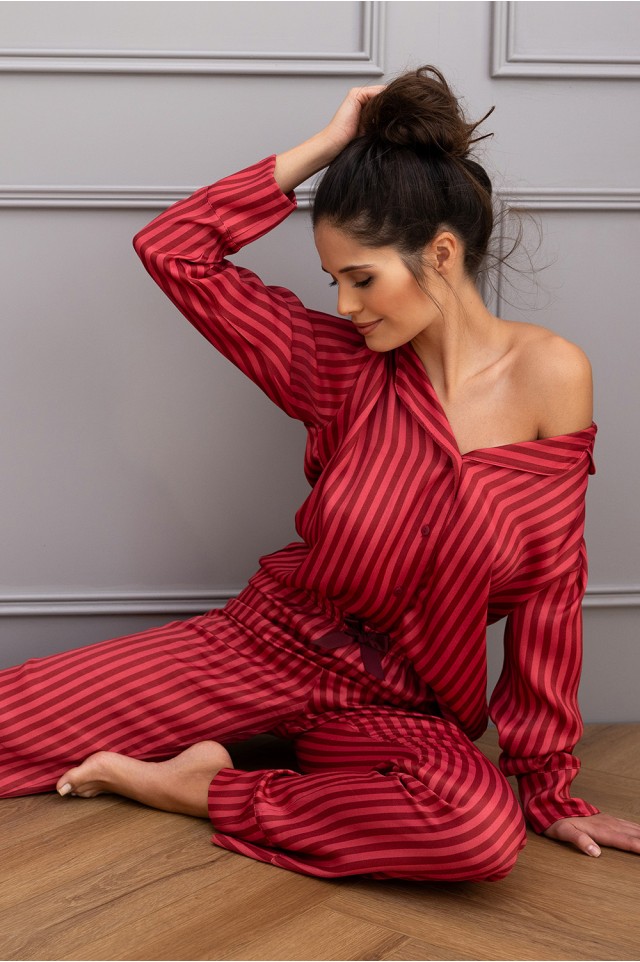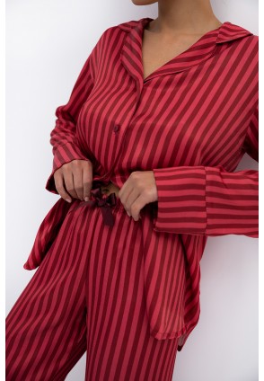 Элегантный домашний комплект Rosemary, в полоску, состоит из рубашки на пуговицах и прямых брюк. Рукава и брюки оформлены манжетами. Рубашка на пуговицах с фигурным воротником. Идеальный вариант не только для сна, но и для домашнего отдыха.
