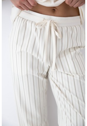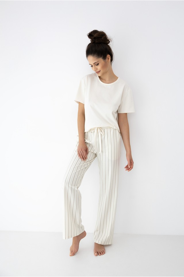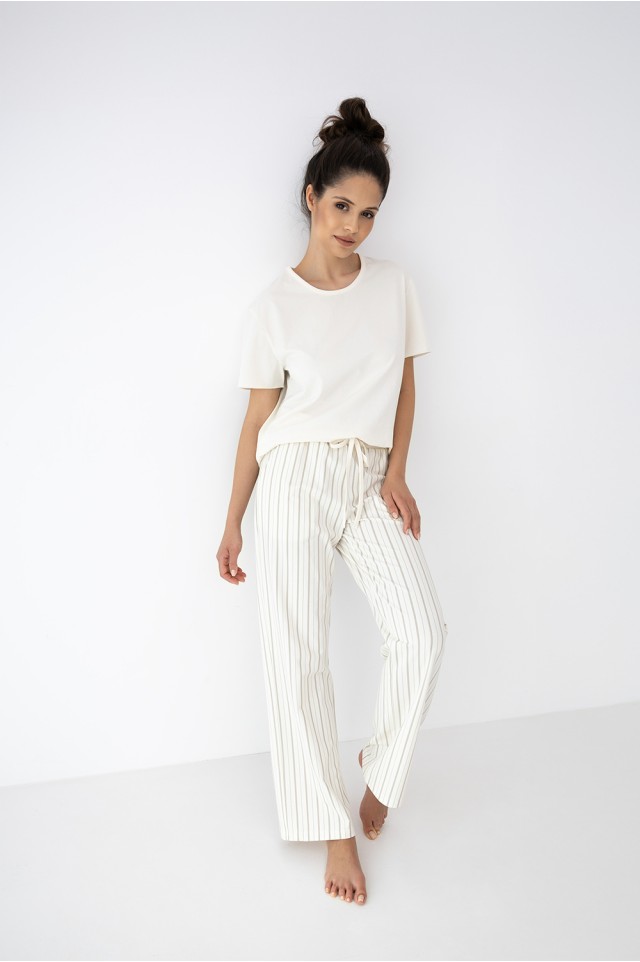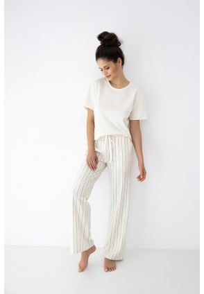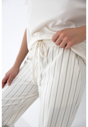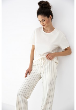 Домашний комплект Simona состоит из футболки и брюк в полоску. Футболка однотонная прямого кроя. Идеальный вариант не только для домашнего отдыха, но и для прогулки.
