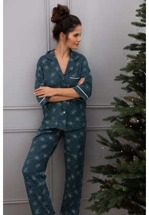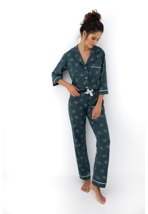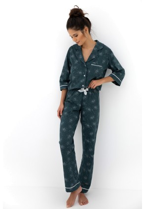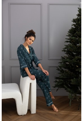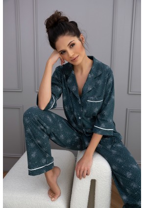 Повседневная пижама Sydney темно-синего цвета состоит из рубашки и прямых брюк. Рубашка на пуговицах, с фигурным воротником и рукавами 3/4. На груди накладной карман. Идеальный вариант не только для сна, но и для домашнего отдыха.
