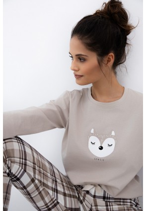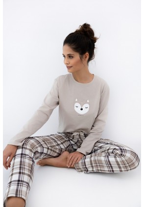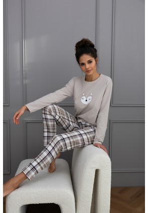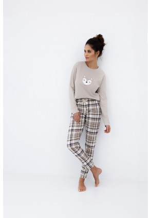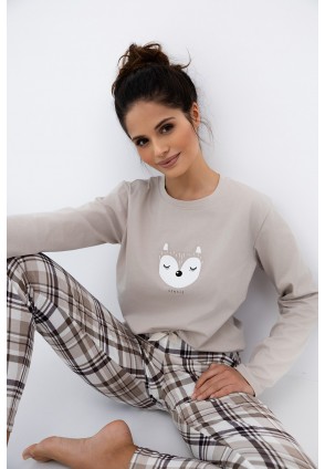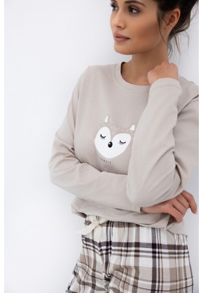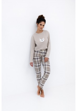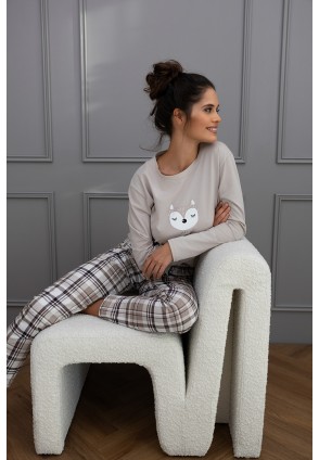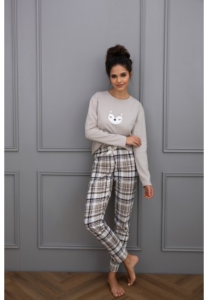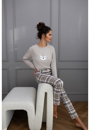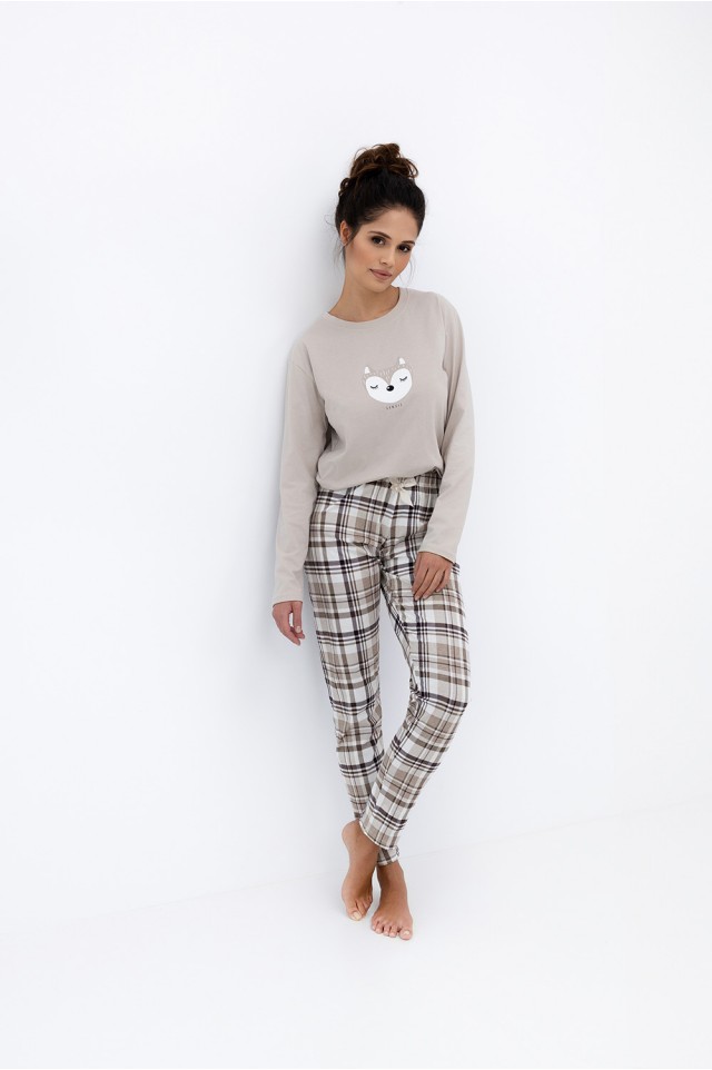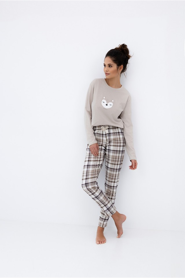 Повседневная пижама Tinsley с зауженными брюками и однотонным лонгсливом. Лонгслив с круглым вырезом горловины и с забавным принтом на груди. Брюки в крупную клетку и с контрастным бантиком на поясе. Идеальный вариант не только для сна, но и для домашнего отдыха.