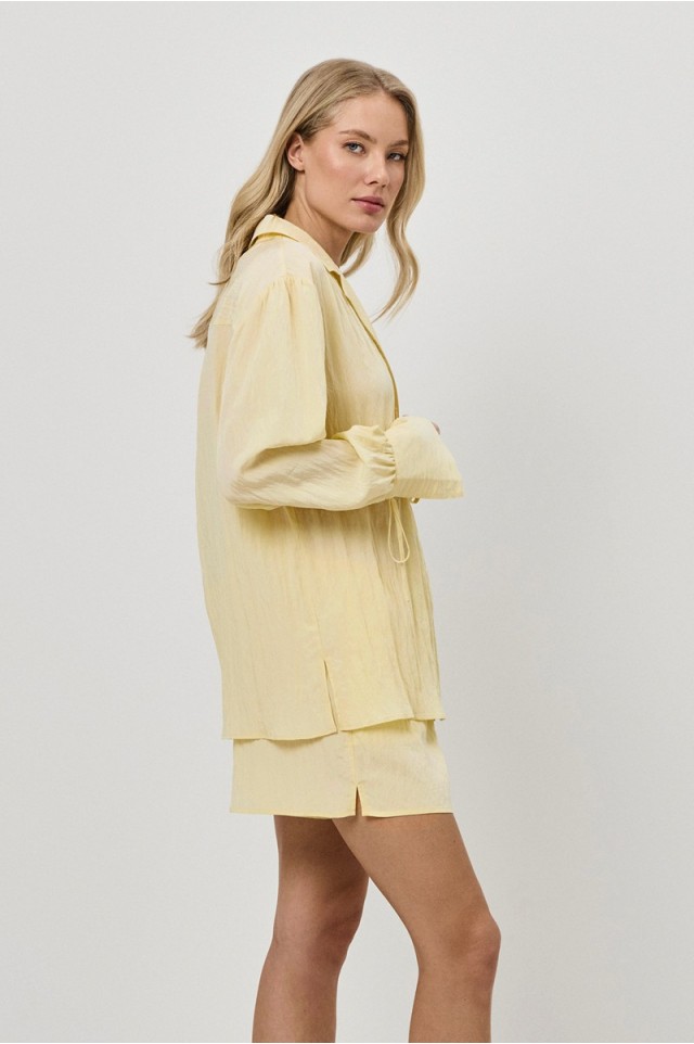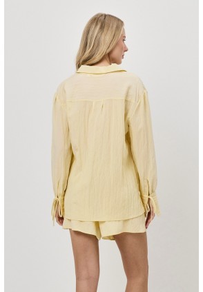 Комплект женский с шортами SOLARA. Выполнен из вискозы с добавлением нейлона. Легкая ткань с жатым эффектом, придающая ощущение воздушности. Рубашка на пуговицах с отложным воротником, длинные рукава с завязками. Шорты свободного кроя с поясом на эластичной резинке с кулиской и боковыми карманами, по бокам маленькие разрезы. Подходит для отдыха дома и прогулок на пляже.