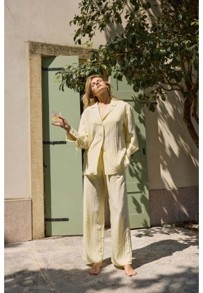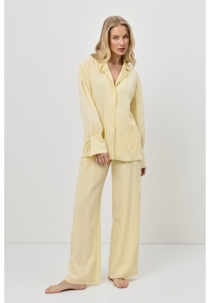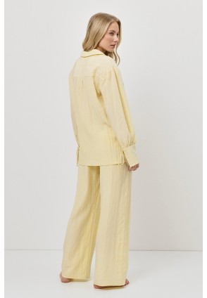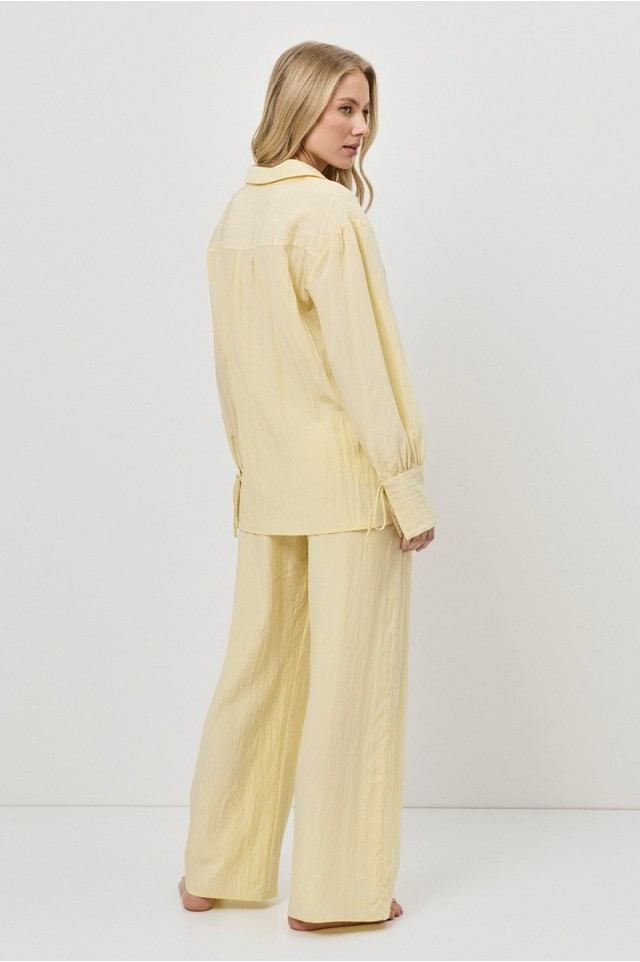 Комплект женский со штанами SOLARA. Выполнен из вискозы с добавлением нейлона. Легкая ткань с жатым эффектом, придающая ощущение воздушности. Рубашка на пуговицах с отложным воротником, длинные рукава с завязками. Штаны свободного кроя с поясом на эластичной резинке с кулиской и боковыми карманами. Подходит для отдыха дома и прогулок на пляже.