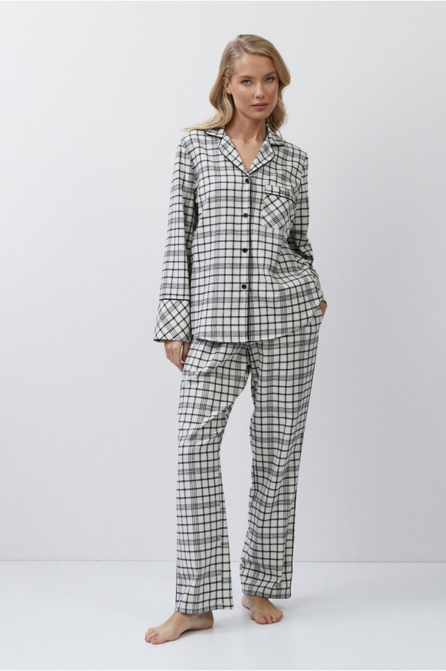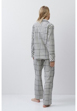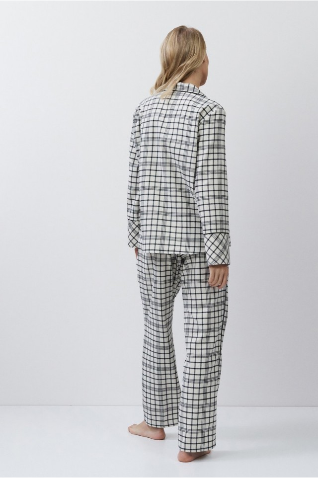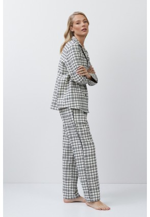 Пижама женская с шортами TERRA для вашего ночного комфорта. Пижама изготовлена из фланелевого хлопка с принтом в клетку. Рубашка на пуговицах, с длинными рукавами, отложным воротником и нагрудным карманом. Окантовка дополняет и украшает комплект. Штаны свободные, с эластичным поясом с завязкой. Расслабьтесь с максимальным комфортом и стилем в пижаме TERRA.