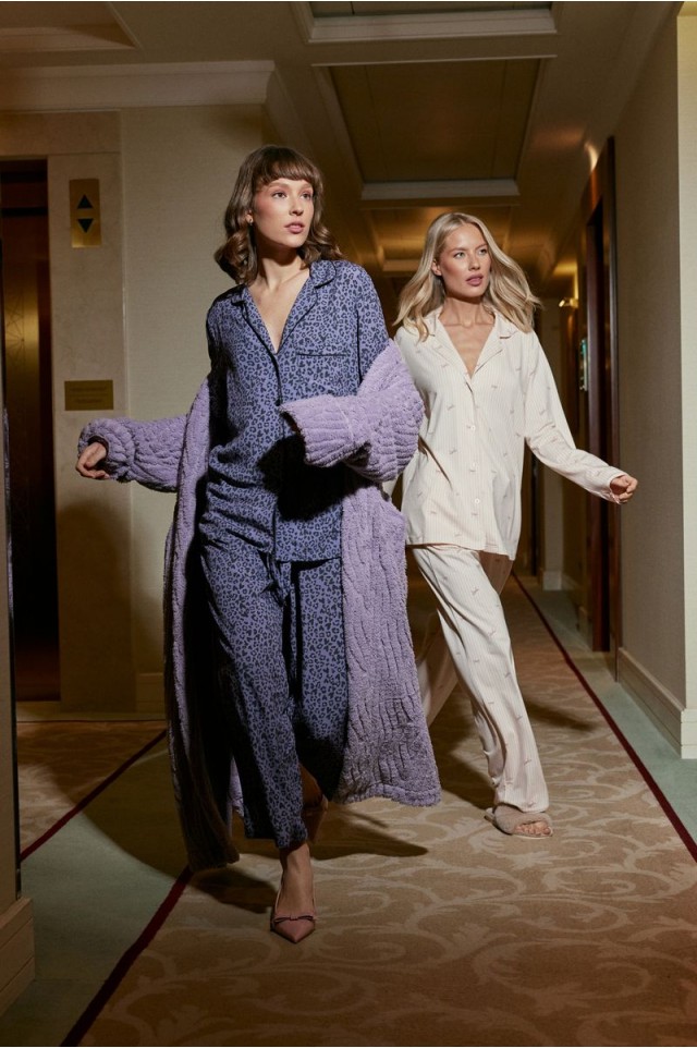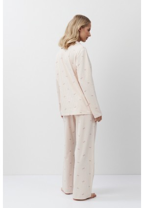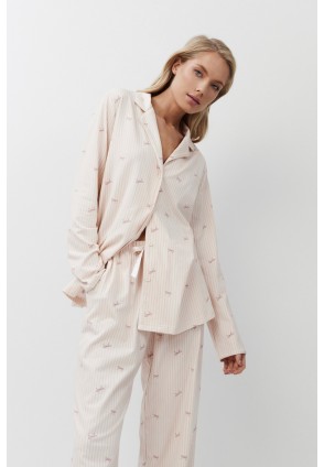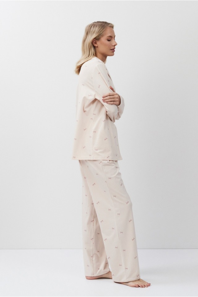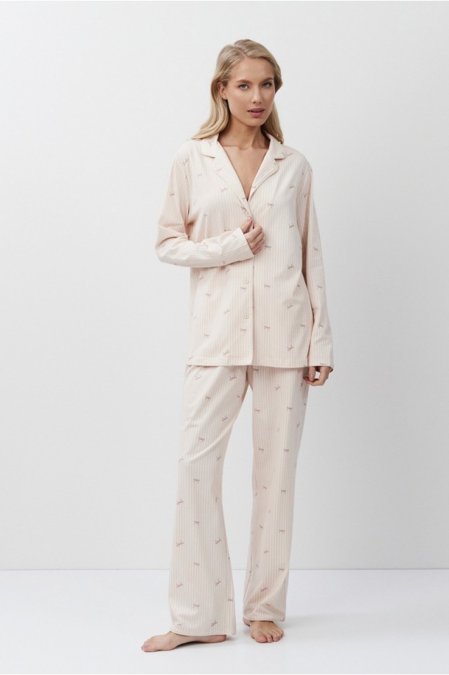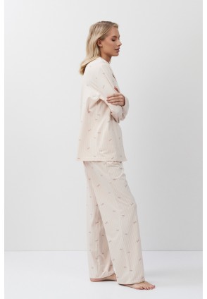 Пижама женская со штанами ROMIE для максимального комфорта и расслабления. Выполнена из приятной к телу мягкого модала с хлопком. Рубашка на пуговицах, с отложным воротником и V-образным вырезом. Рукава длинные. Штаны длинные, свободные, с комфортной посадкой, эластичный пояс со шнурком. Пижама станет вашим идеальным спутником во время сна.
