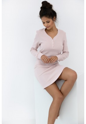 Полуоблегающее домашнее платье Arlette в рубчик нежного светло-розового цвета. Глубокий вырез, воротник v-образный, на кулиске. Длина сорочки выше колена, рукава короткие. Длина платья чуть выше колена. Идеально подойдет не только для сна, но и для отдыха в домашней обстановке.